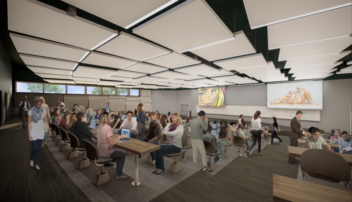 The program includes two lecture halls – one being a large 400 seat hall with adjacent Media Lounge, multiple Smart- and Active Learning classrooms, informal collaboration areas integrated into circulation zones, and flexible office space for staff and faculty.