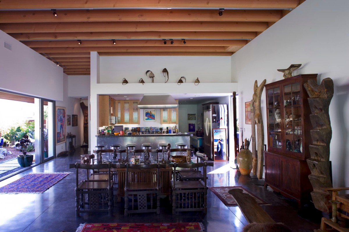 A safari spirit and big game motif permeate the interior. The 13 ft high, white walls of the main living space display eclectic African treasures from many regions.